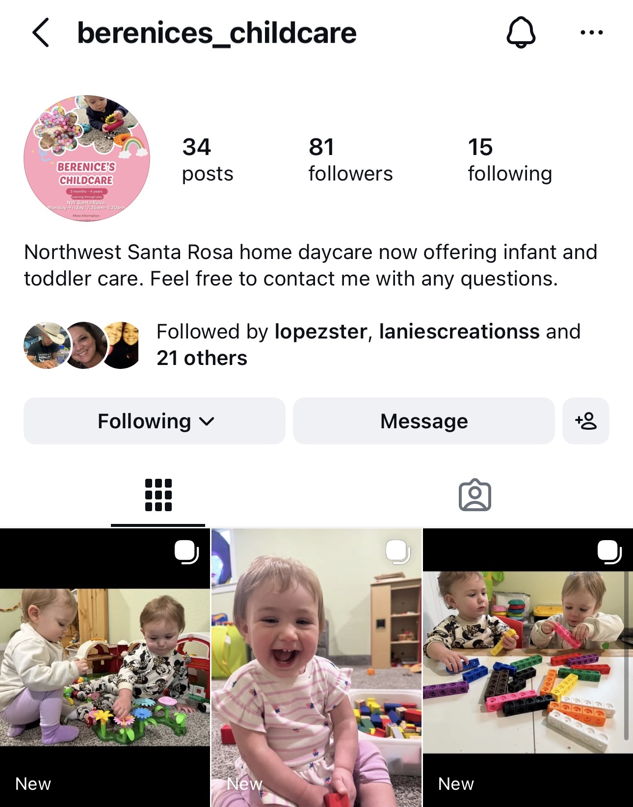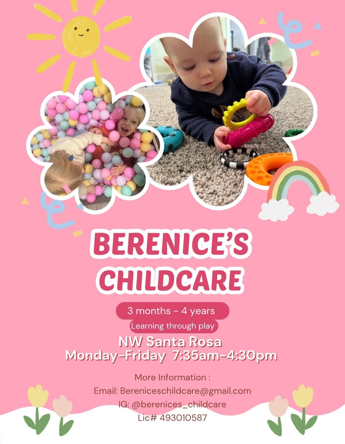 so you can see daily moments of joy, updates, and glimpses into the enriching, playful environment she creates for little learners. With a growing list of families hoping to secure a spot, Bernice’s daycare continues to be a trusted and beloved choice for early childhood care in Santa Rosa.